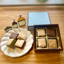 4種類の味の生チョコ (ミルク、ゆず、スイート、抹茶)を アーモンド風味のサブレでサンドしました。