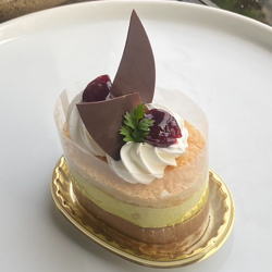 なめらかなピスタチオムースとムースショコラの組み合わせ。センターのグリオットチェリーがアクセントになっています。